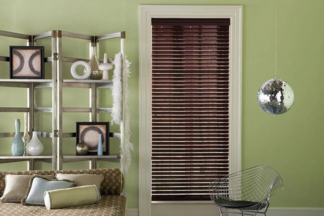 The warm, elegant look of real wood blinds in faux and composite wood options that meet certain room requirements.